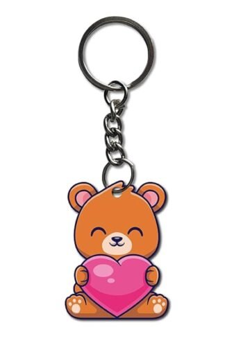 Heart-Centric Design: The centerpiece is a cute, seated brown bear with a friendly expression, holding a large pink heart. The vibrant colors and clean outlines create a modern, “kawaii” aesthetic.