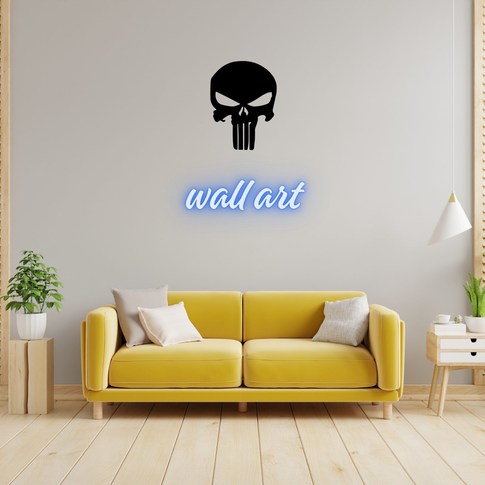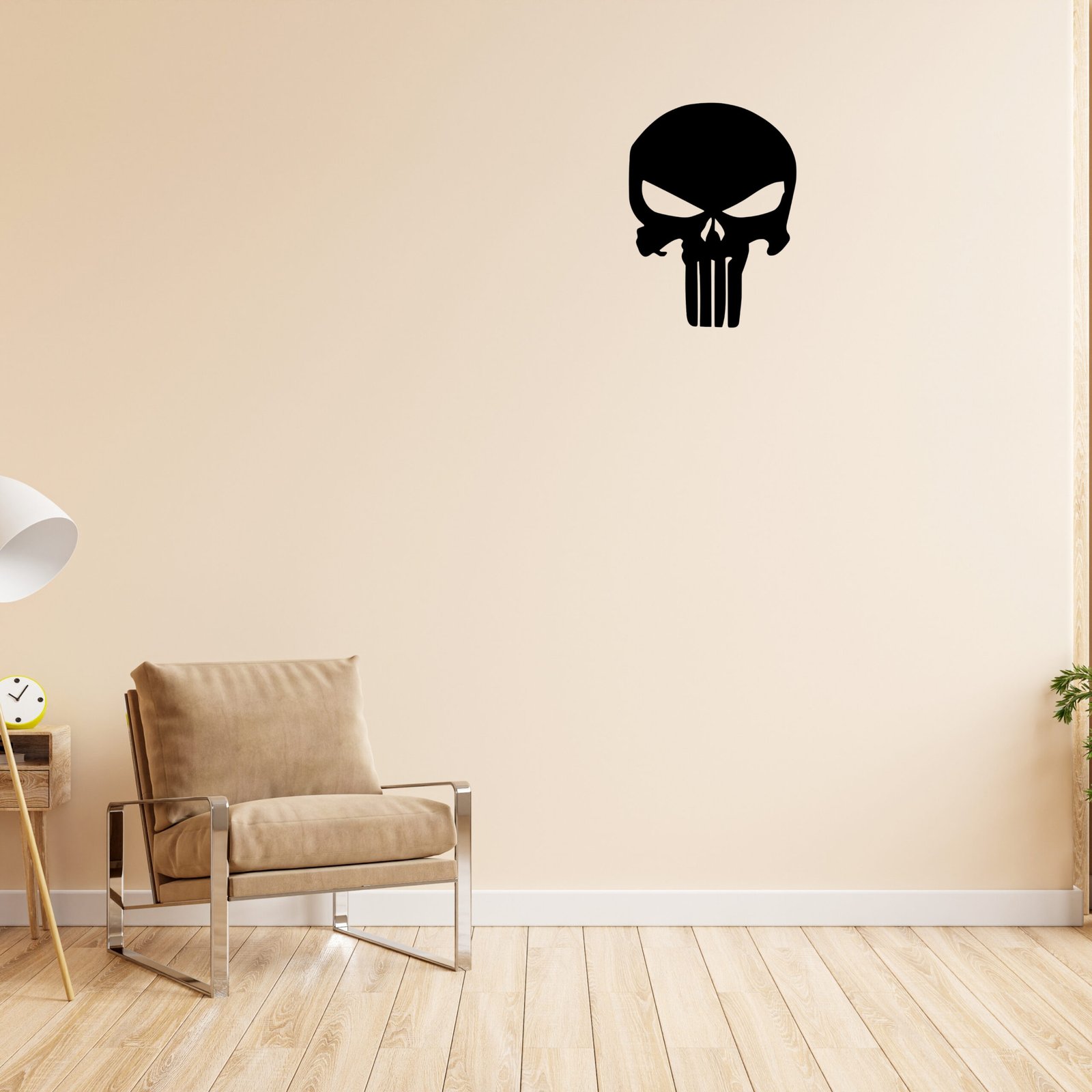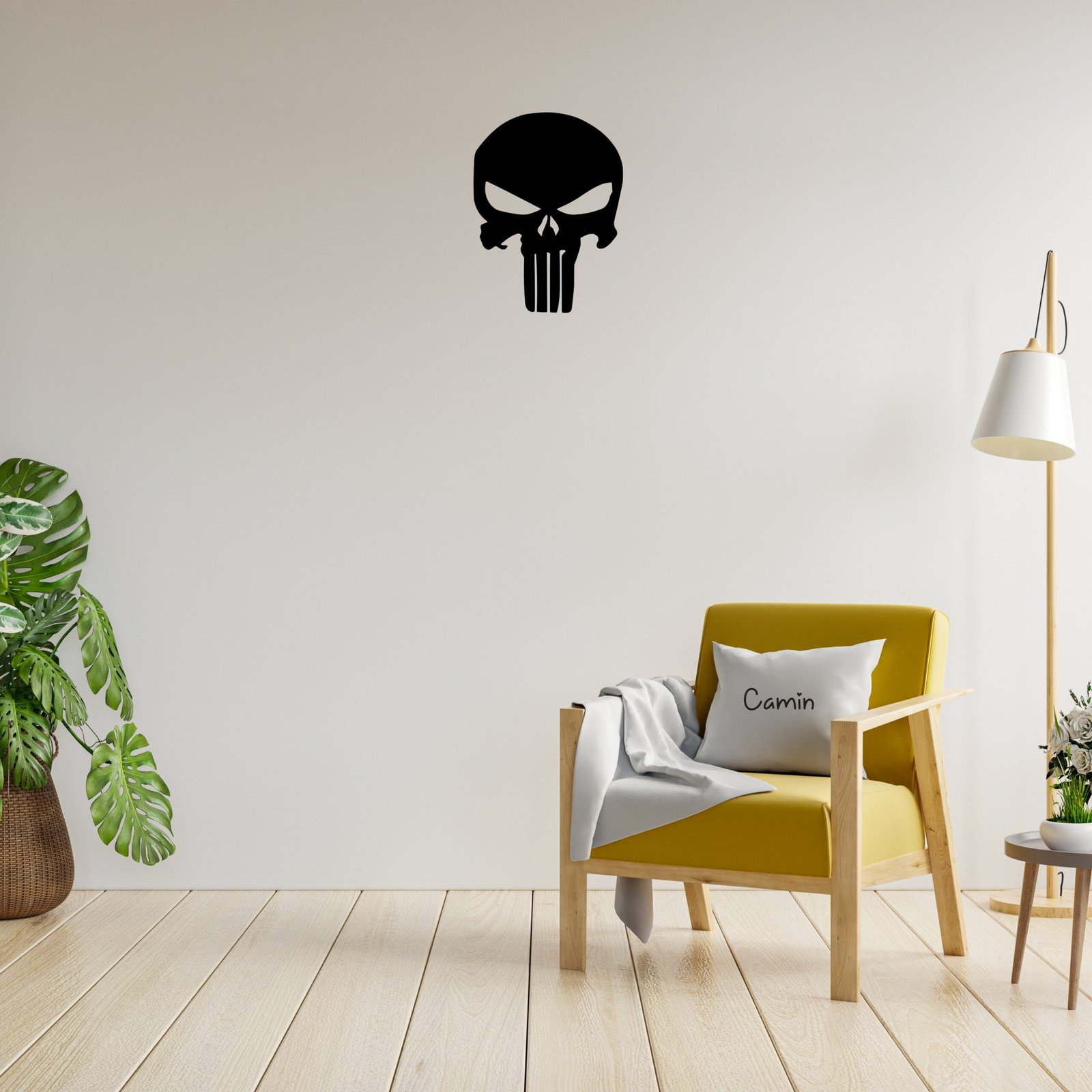 Punisher-Inspired MDF Wooden Wall Art A striking, matte black skull wall hanging precision-cut from high-quality MDF wood. This minimalist yet powerful silhouette is perfect for adding a touch of “dark hero” aesthetic to your bedroom, gaming room, or offic