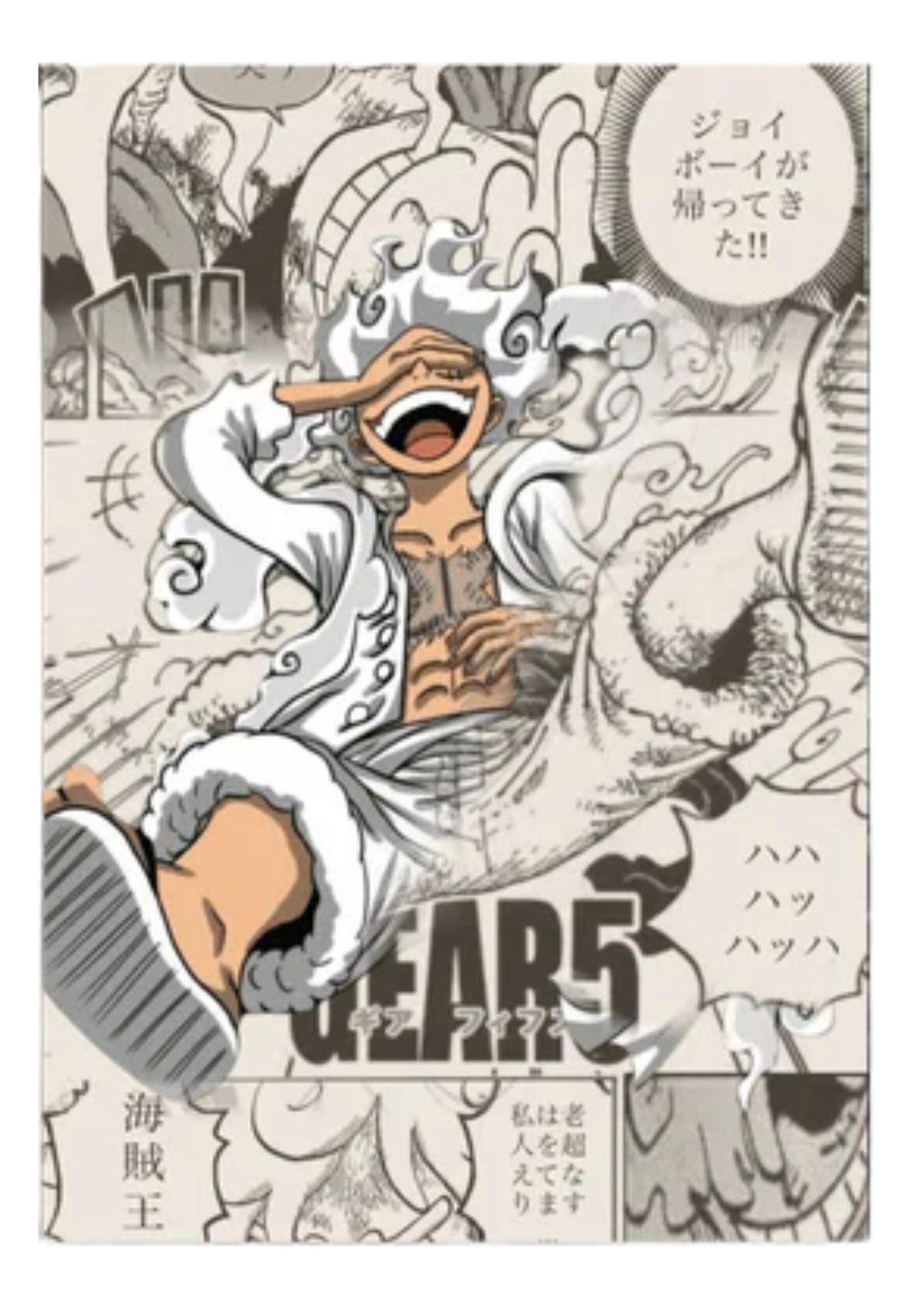This high-energy poster celebrates one of the most significant milestones in manga history: the awakening of Monkey D. Luffy’s Gear 5.