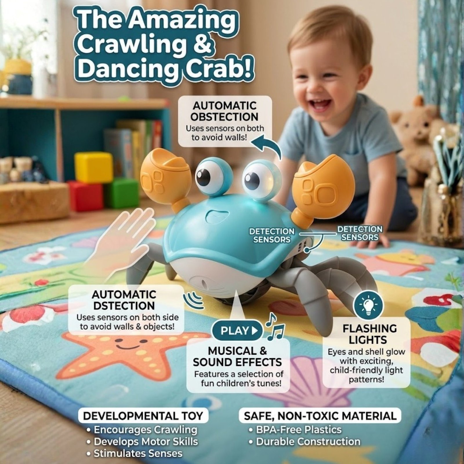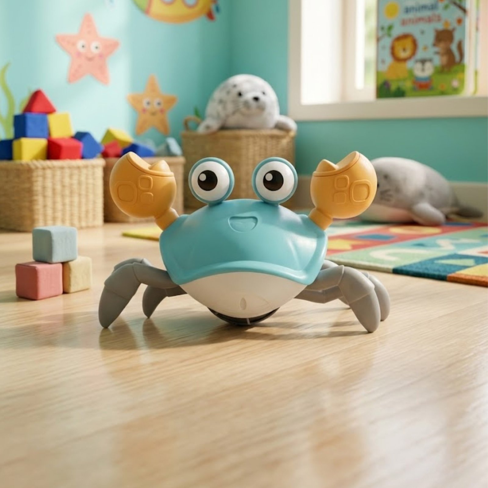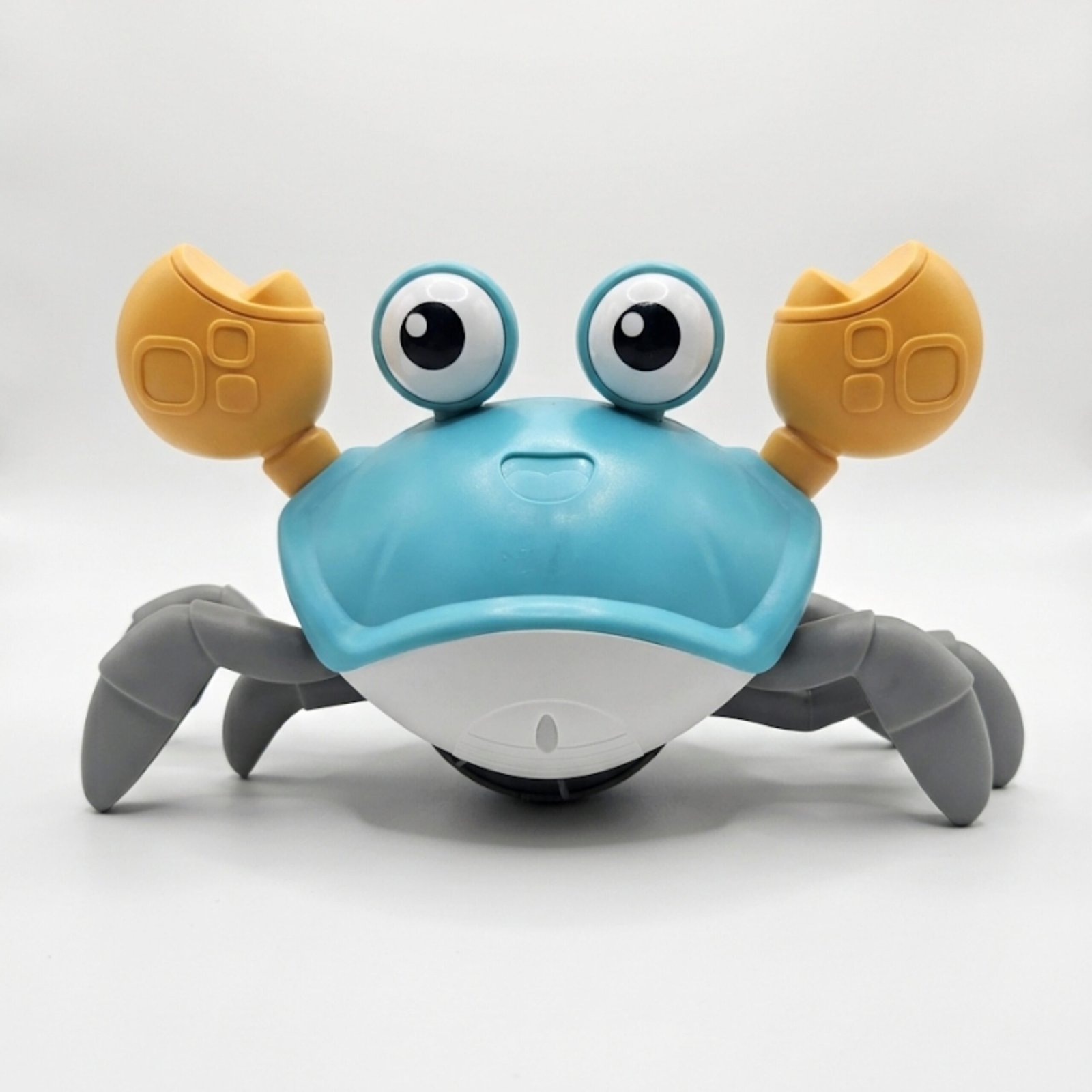 The Amazing Crawling & Dancing Crab is an interactive developmental toy designed to keep toddlers engaged and moving. Featuring smart obstacle avoidance, catchy musical sound effects, and vibrant flashing lights, this blue and orange crab encourages babies to crawl and helps develop essential motor skills through active play.